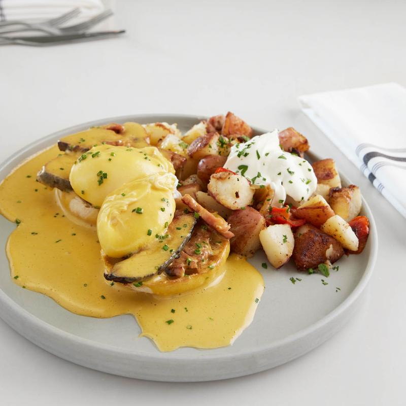 Two Soft Poached Eggs, English Muffin & Home Fries